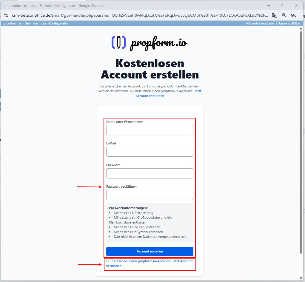 Wenn du den Dienst das erste Mal aufrufst, kannst du entweder einen neuen propform.io-Account anlegen oder, falls du bereits einen Account hast, deinen bestehenden propform.io-Account verbinden.