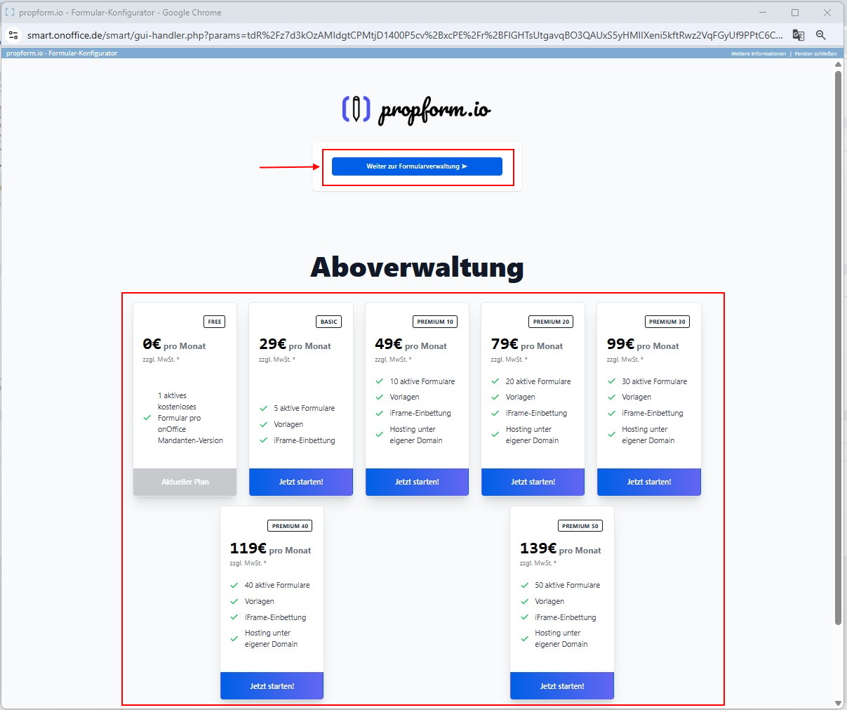 Bei allen weiteren Aufrufen des Dienstes siehst du folgende Seite. Mit einem Klick auf "Weiter zur Formularverwaltung" wirst du automatisch weitergeleitet zu propform.io. Im unteren Bereich kannst du dein Abo verwalten.