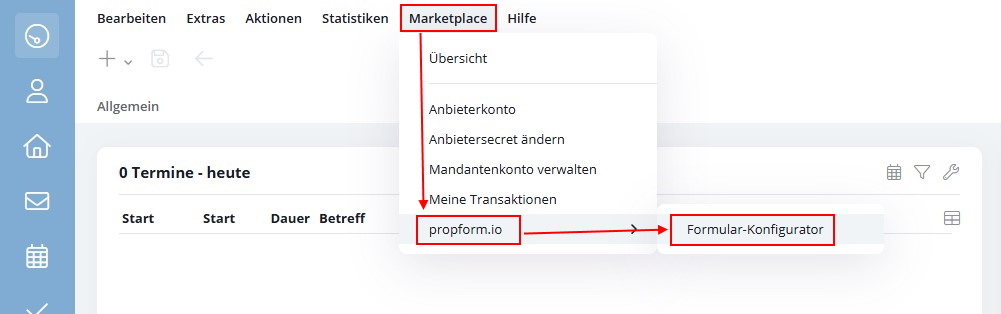 Klicke in der onOffice-Menüleiste auf "Marketplace"->"propform.io"->"Formular-Konfigurator".