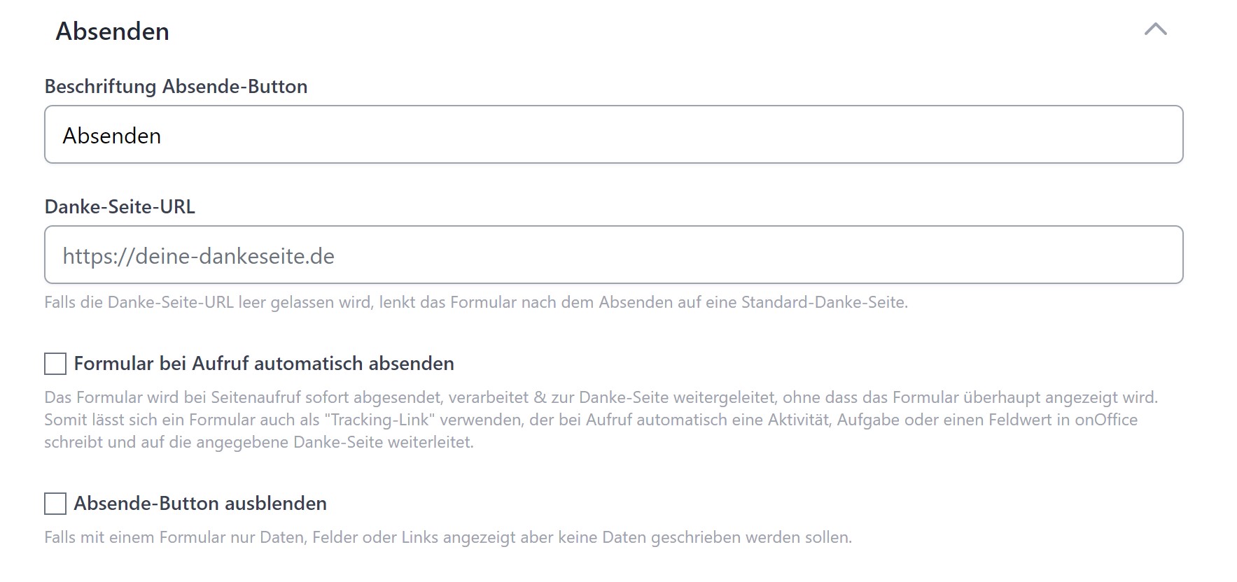 - Danke-Seite-URL: Gibst du keine Dankeseite an, wird nach dem Absenden auf eine Standard-Danke-Seite