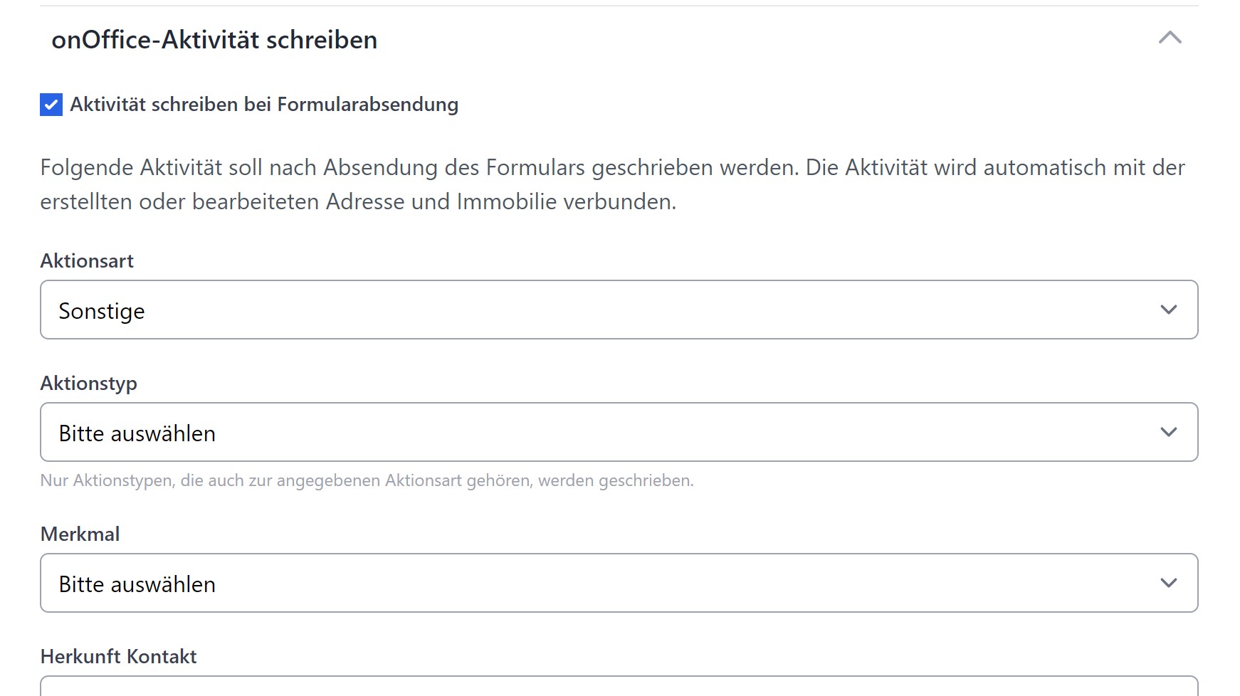 Wenn du den Haken, "Aktivität schreiben bei Formularabsendung" aktivierst, werden dir die entsprechenden Felder für die Konfiguration der zu erstellenden Aktivität angezeigt.