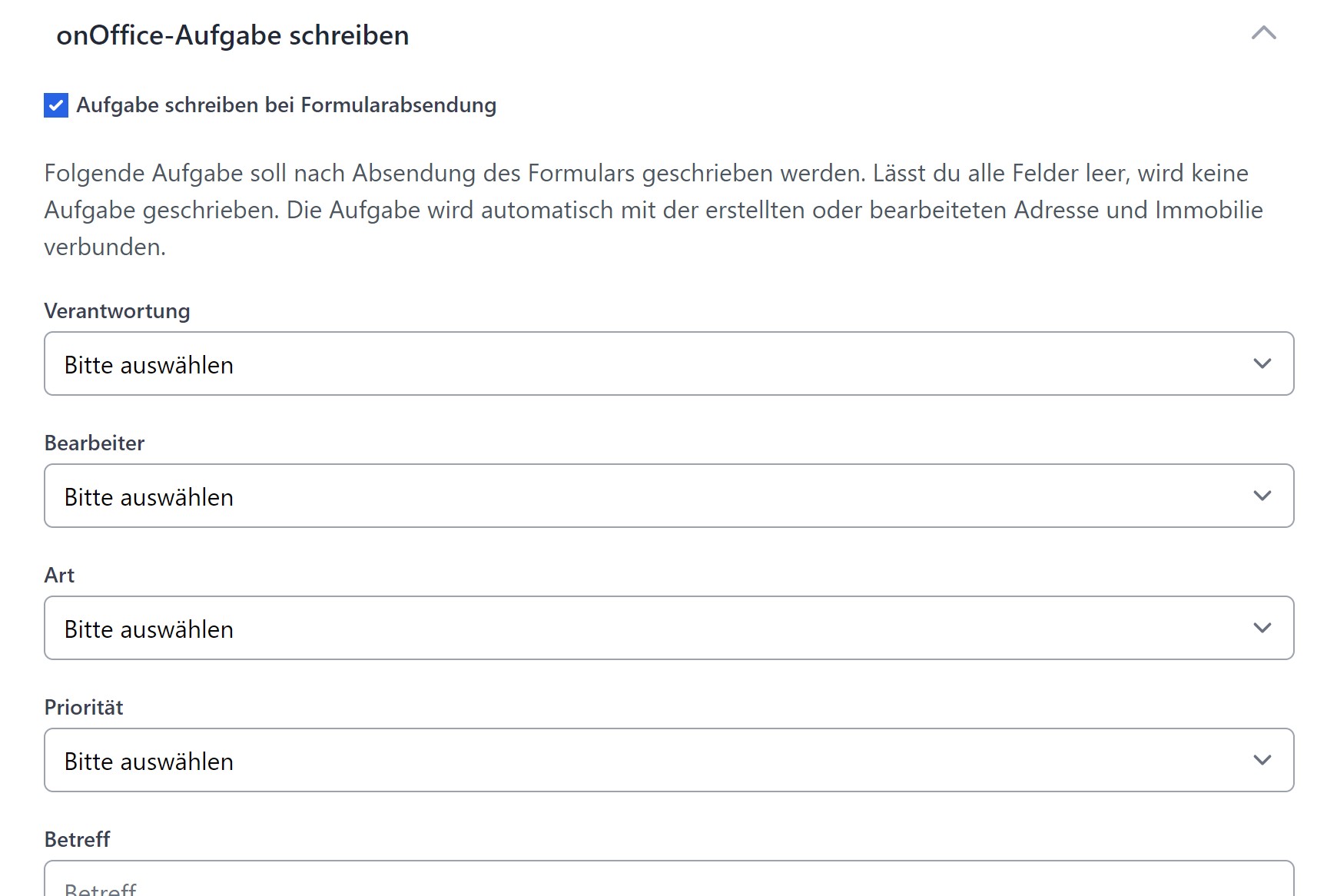 Wenn du den Haken, "Aufgabe schreiben bei Formularabsendung" aktivierst, werden dir die entsprechenden Felder für die Konfiguration der zu erstellenden Aufgabe angezeigt.