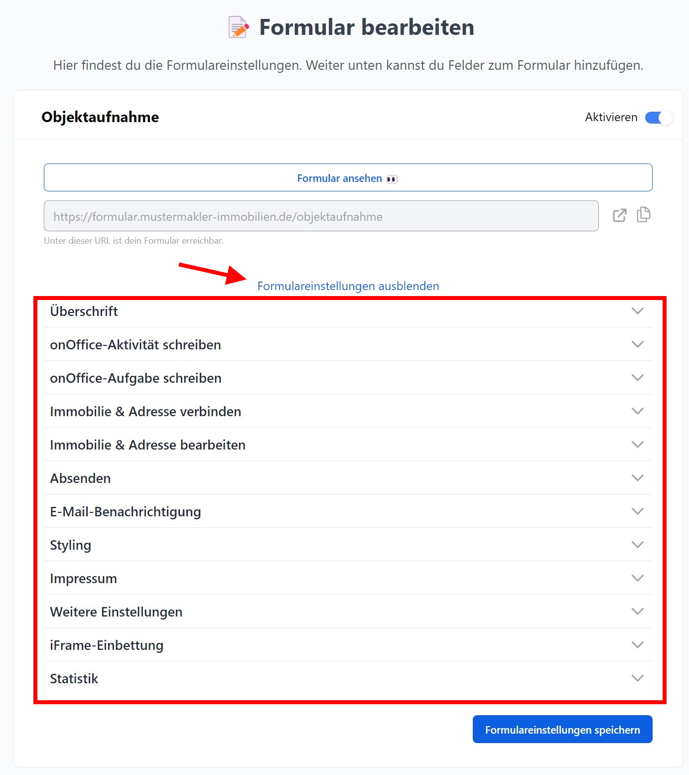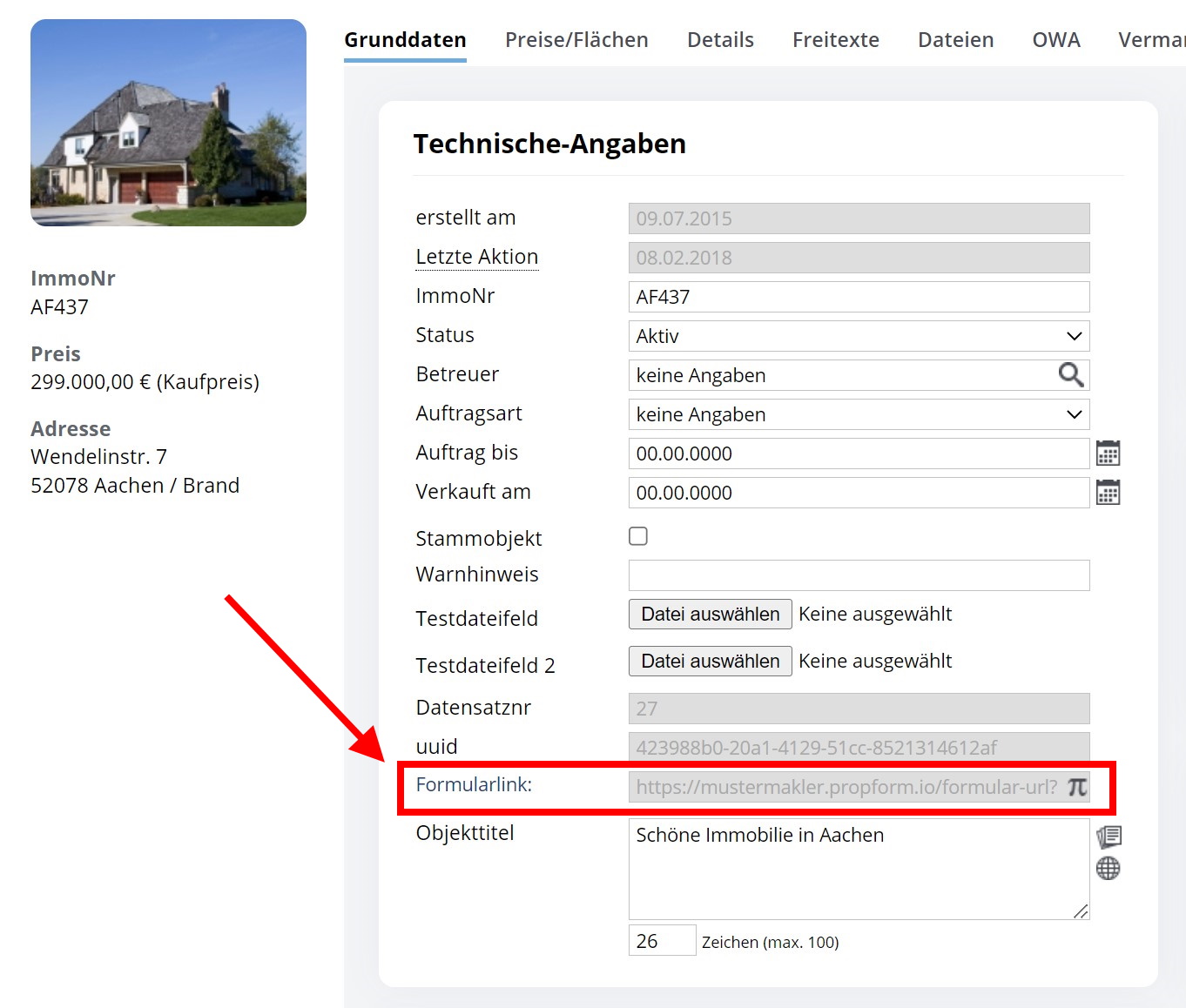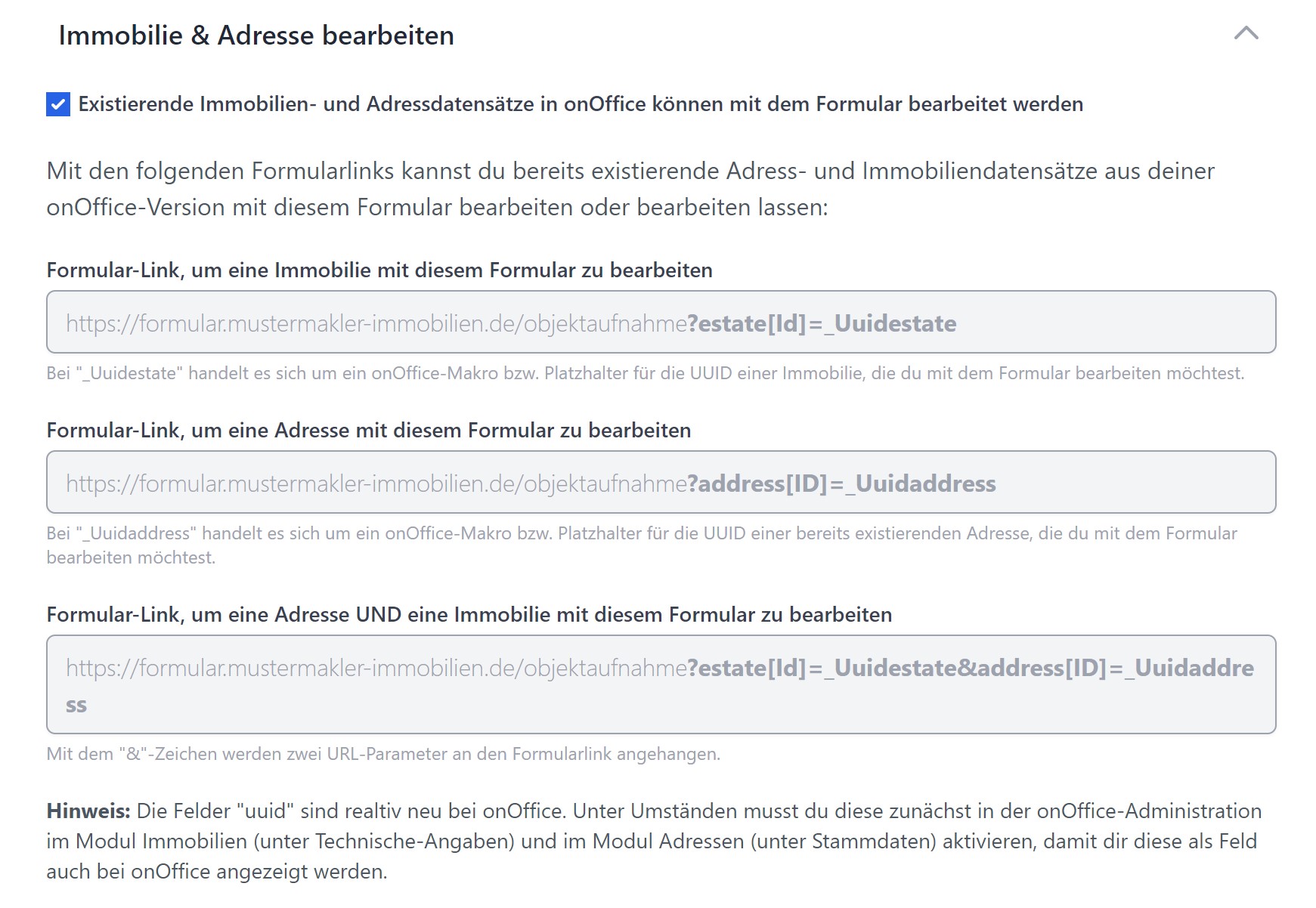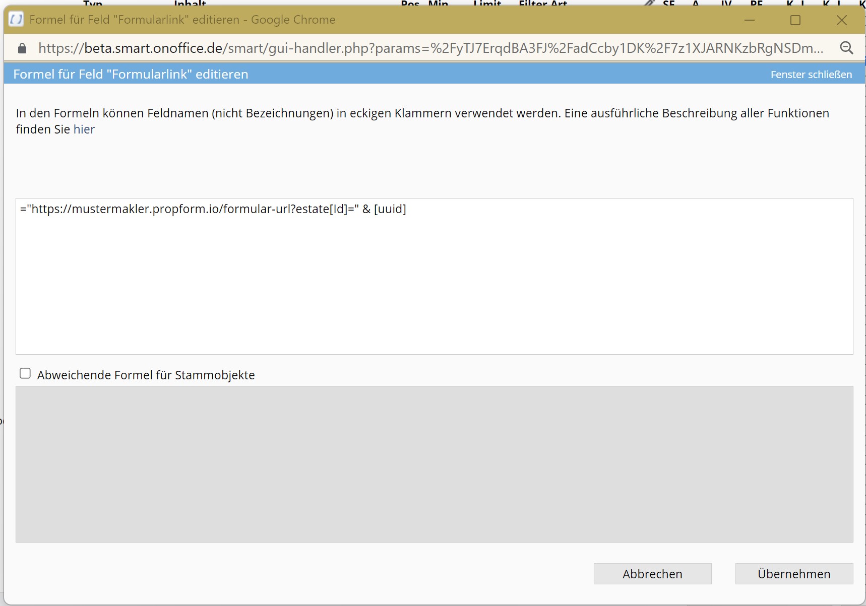 Formularlink per Formel als Feld in der onOffice Immobilien-Maske hinterlegen: ="https://mustermakler.propform.io/formular-url?estate[Id]=" & [uuid]