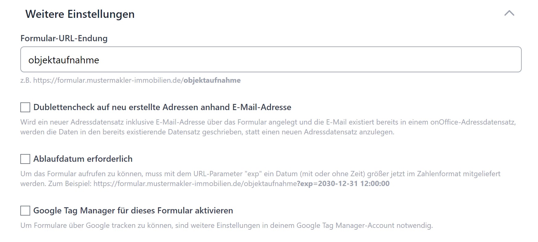 - Ablaufdatum erforderlich: Um das Formular aufrufen zu können, muss mit dem URL-Parameter "exp" ein Datum (mit oder ohne Zeit) größer jetzt im Zahlenformat mitgeliefert werden. Das Formular ist bis zu dem mitgelieferten Datum erreichbar. Zum Beispiel: "https://formular.mustermakler-immobilien.de/objektaufnahme?exp=2030-12-31 12:00:00"