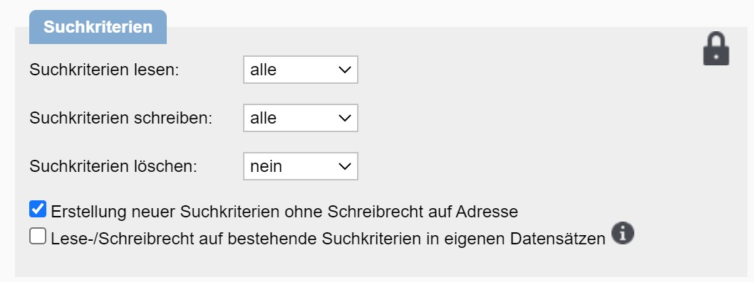 - Erstellung neuer Suchkriterien ohne Schreibrecht auf Adresse: aktiviert (optional, falls du das Schreibrecht für den API-Benutzer in Adressen eingeschränkt hast)