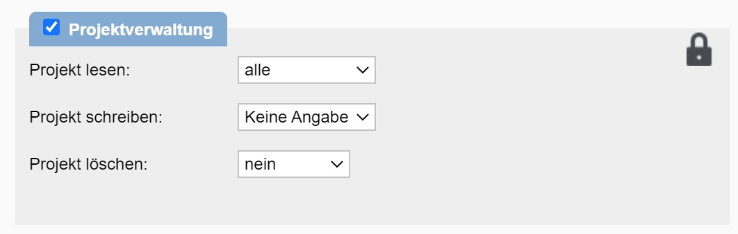 - Projektverwaltung (Haken links neben der Kategorieüberschrift): aktiviert