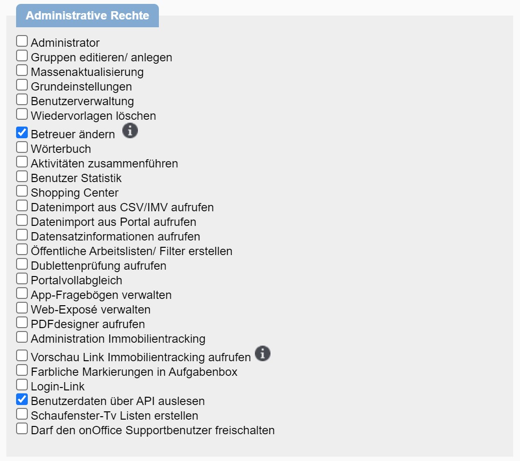 - Darf Objekte auf der eigenen Homepage einstellen: aktiviert (optional, falls du eine onOffice-Internetseite hast und mit Formularen Immobilien auf der eigenen Homepage einstellen willst)