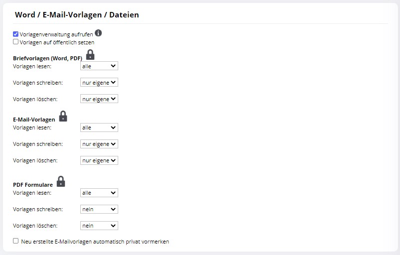 Im Folgenden geben wir dir eine Empfehlung für die Rechte, die der API-Benutzer haben sollte. Du kannst die Rechte aber auch einschränken oder angepasst an deine eigenen Nutzungswünsche. Weitere Rechte, als die unten genannten, können deaktiviert oder auf "nur eigene" eingeschränkt werden.