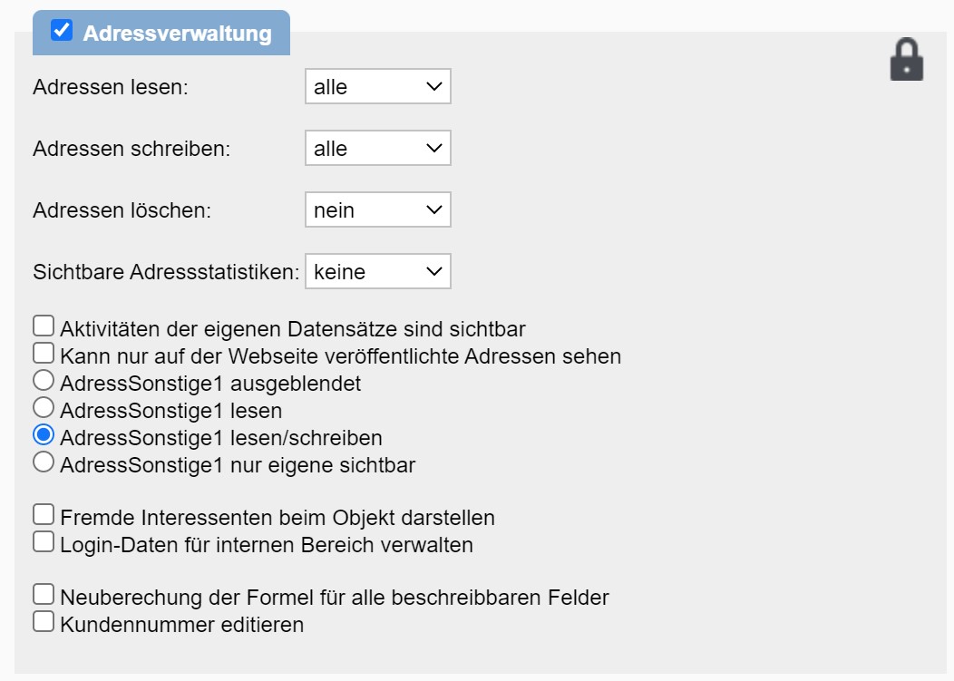 - AdressSonstige1 lesen/schreiben: aktiviert (optional, falls du auch Felder auf dem Reiter AdressSonstige1 mit Formularen bearbeiten willst):