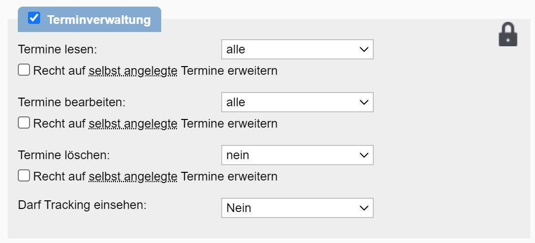 - Terminverwaltung (Haken links neben der Kategorieüberschrift): aktiviert